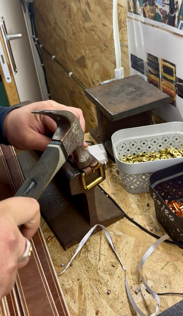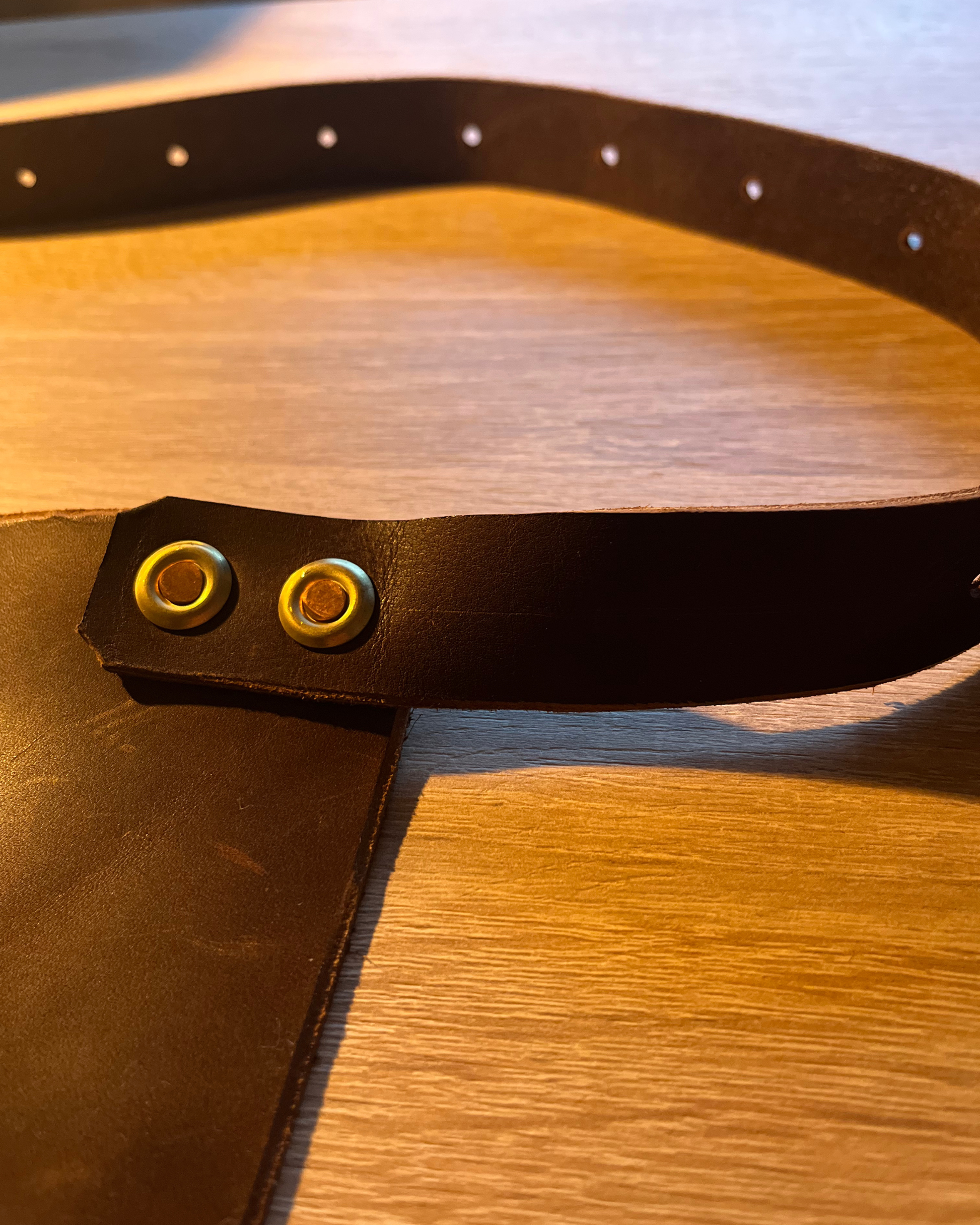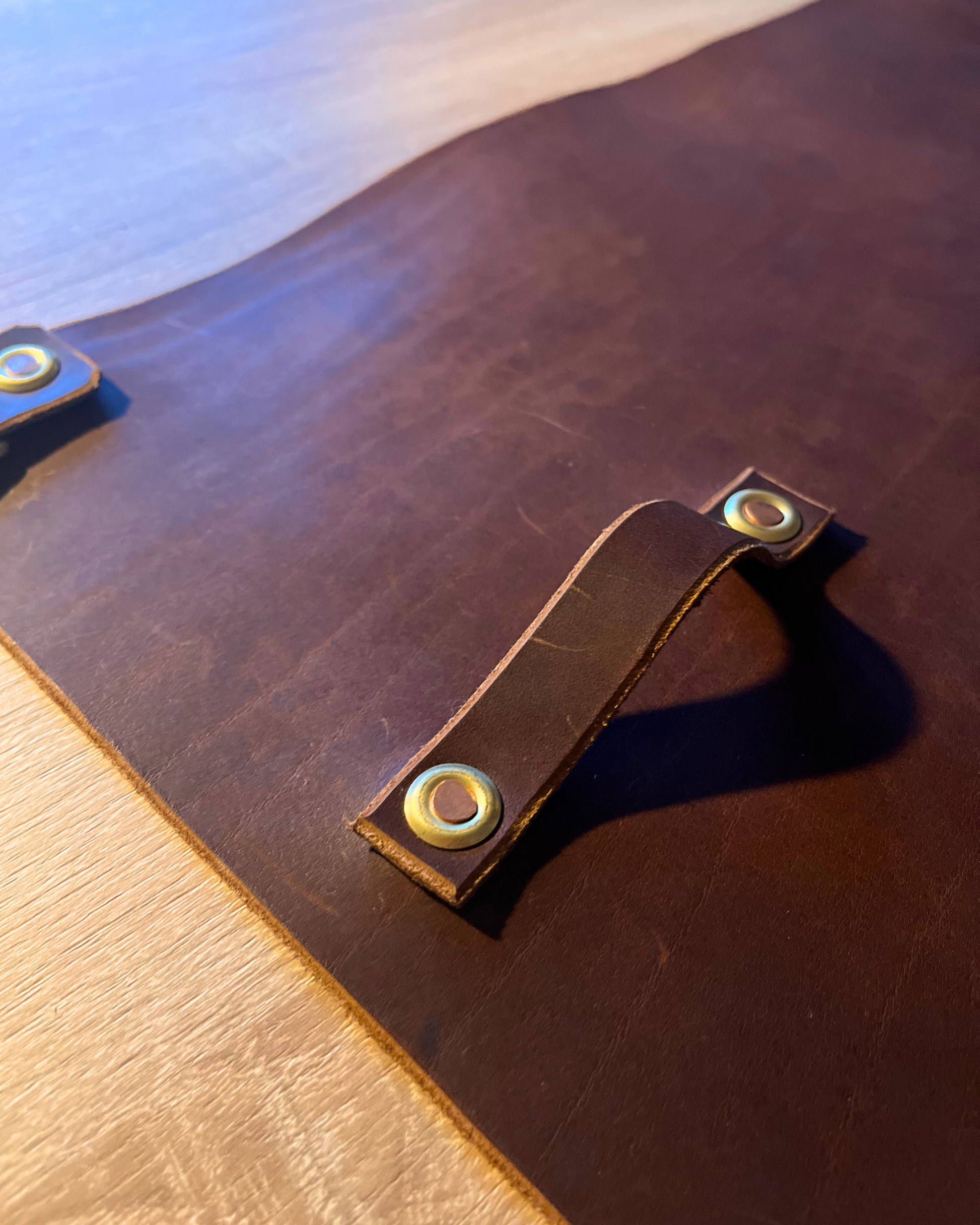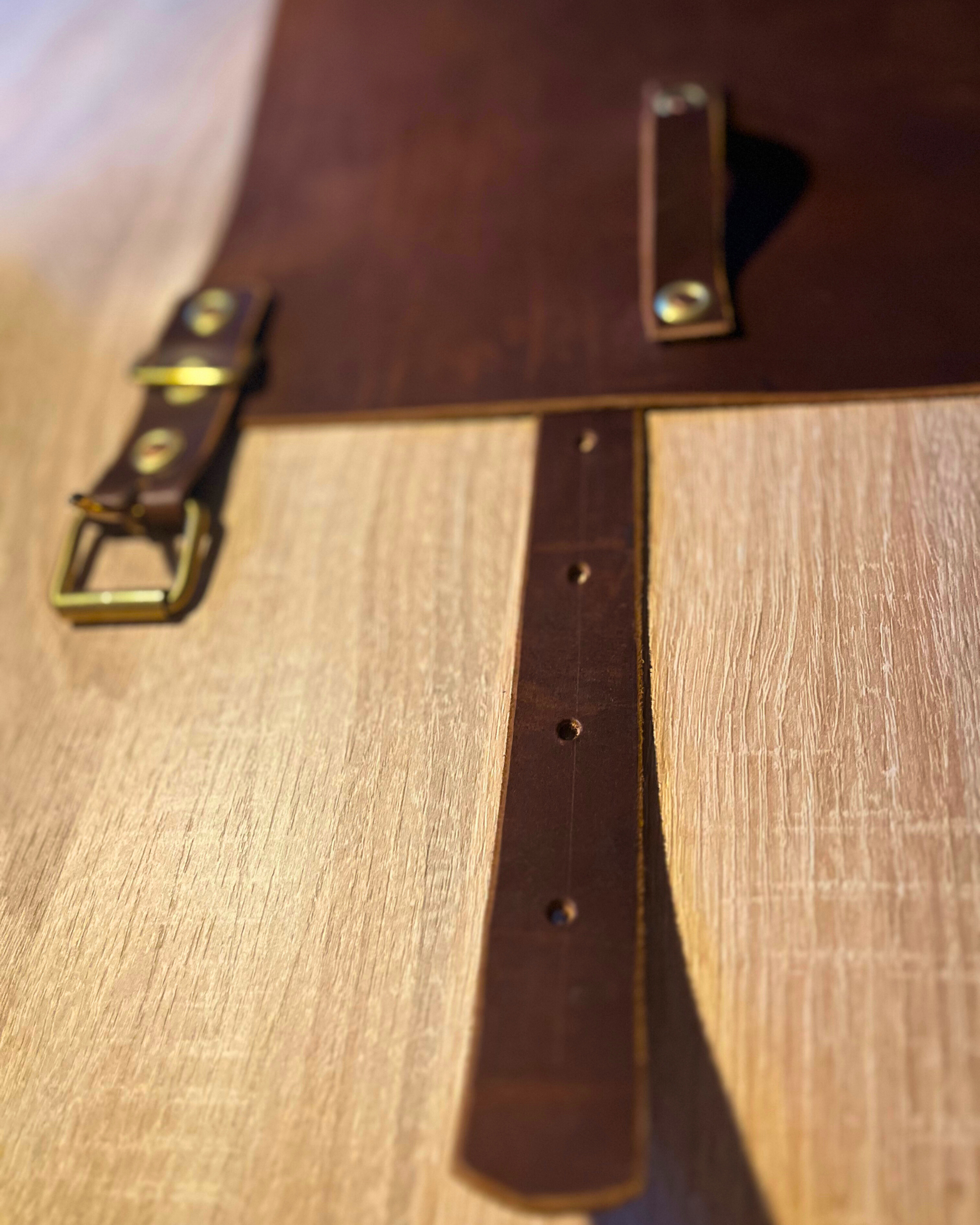 Chaque tablier est fabriqué à partir de cuir végétal issu de vaches Simmental du Ségala, sélectionné pour sa robustesse, son élégance naturelle et sa patine unique qui se bonifie avec le temps.